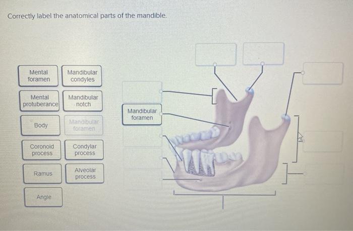 Solved Correctly label the anatomical parts of the mandible ... - Chegg Question: Correctly label the anatomical parts of the mandible. 3 Skipped Alveolar process Mental foramen Ramus Condylar process Coronoid process Mandibular foramen Mental protuberanco Body Angle Mandibular notch Mandibular condyles Reset Zoom, This problem has been solved! See the answer, Show transcribed image text, Expert Answer, Question Th …,