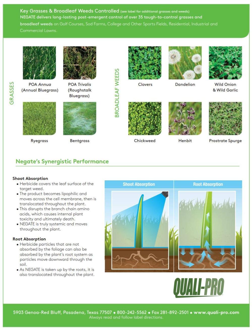 Quali-Pro Negate 37WG Herbicide - DoMyOwn.com Quali-Pro Negate 37WG Herbicide is uniquely formulated to provide quick and complete post-emergent control of poa annua (annual bluegrass) and over 35 grasses and broadleaf weeds in Bermuda grass and Zoysia grass turf. Now labeled for use on residential turf, one application provides 8 to 12 weeks of exceptionally reliable control.