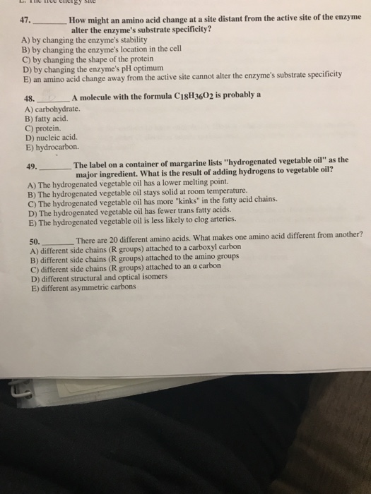 Biology Chapter 5 Flashcards | Quizlet 22) The label on a container of margarine lists "hydrogenated vegetable oil" as the major ingredient. Hydrogenated vegetable oil _____. A) is solid at room temperature B) has more "kinks" in the fatty acid chains C) has fewer trans fatty acids D) is less likely to clog arteries A 23) Saturated fatty acids _____.