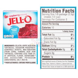 Diet Jello Nutrition Facts - cullyskitchen.com 4-The sugar-free version of diet Jello has zero grams of carbs per serving, and aA 100-gram serving contains 62 calories. The original Jello is low in calories and carbs, but sugar-free varieties are lower in calories and fat. However, the sugar-free version of the product is the best choice for people with type 2 diabetes. Sugar Free Jell-o - Walmart.com Jell-O Orange Sugar Free Gelatin Dessert Mix (0.3 Oz Box) $58.30. (Price/Case)Jell-O Sugar Free Gelatin Lemon, 0.3 Ounces, 24 per case. $28.99. Jell-O Sugar Free Gelatin Sampler (Bundle of 8 Different Flavors .3-oz) $5.49. Jell-O Chocolate Fudge Sugar Free & Fat Free Instant Pudding & Pie Filling Mix, 1.4 oz Box. 63. Sugar-Free Jell-O Nutrition Facts, Ingredients, Calories, Benefits Sugar-Free Jello Nutrition Nutrition Facts servings per container Serving size 4 oz (60g) Amount per serving Calories 12 % Daily Value* Total Fat 0g 0% Saturated Fat 0g 0% Trans Fat 0g Cholesterol 0mg 0% Sodium 29mg 2% Total Carbohydrate 2.5g 1% Dietary Fiber 0g 0% Total Sugars 0g Includes 0g Added Sugars 0% Protein 0.5g Vitamin D 0mcg 0%