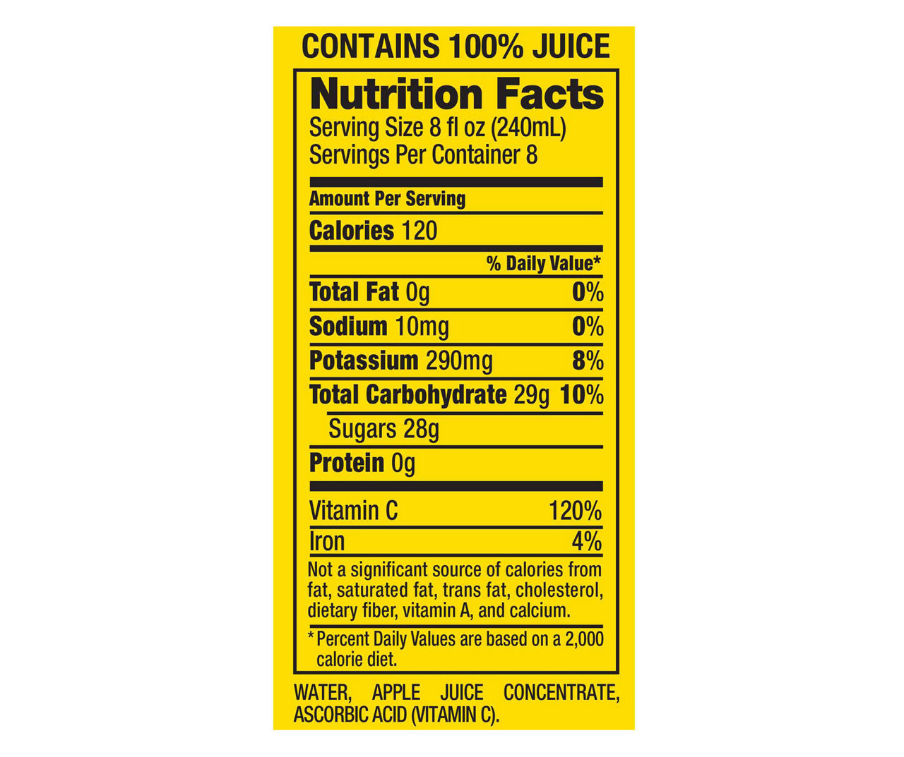 Mott's 100% Apple Juice Allergy and Ingredient Information Sodium 0.015g 0.62% Potassium 0.29g 8.28% Total Carbohydrates 29g 9.66% Sugars 28g Protein 0g Vitamin A 0% Vitamin C 20% Calcium 0% Iron 4% *Percentage Daily Values are based on a 2,000 calorie diet. Your daily values may be higher or lower depending on your calorie needs. DISTRIBUTED BY: Mott's Mott's 100% Apple Juice Original - Stop & Shop Real fruit 100% juice. 120 calories per 8 fl oz serving. 120% DV Vitamin C. 2 servings of fruit (Provides 2 servings of fruit per 8 fl oz. Current USDA dietary guidelines recommend a daily intake of 2 cups of fruit for a 2,000 calorie diet. 1 serving = 1/2 cup) per 8 fl oz. Gluten free. No sugar added. 100% juice from concentrate with added ... Calories in Apple Juice and Nutrition Facts - FatSecret Apple Juice Nutrition Facts Serving Size 1 cup Amount Per Serving Calories 117 % Daily Values* Total Fat 0.27g 0% Saturated Fat 0.047g 0% Trans Fat - Polyunsaturated Fat 0.082g Monounsaturated Fat 0.012g Cholesterol 0mg 0% Sodium 7mg 0% Total Carbohydrate 28.97g 11% Dietary Fiber 0.2g 1% Sugars 27.03g Protein 0.15g Vitamin D - Calcium 17mg 1% Iron Mott's, Natural Apple Juice, No Sugar Added Nutrition Facts KEY FACTS. (learn about health benefits or risks) Has low calorie density - this means that the amount of calories you are getting from an ounce is low (0.02 cal/oz). Rich in vitamins and minerals (27.7%/cal) - a good source of Manganese and Vitamin C. Does not contain any risky components such as sodium, cholesterol, saturated fat and added sugar!
