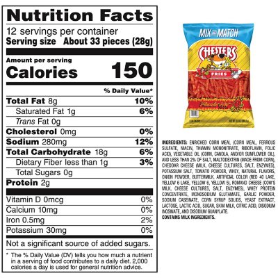 Hot fries nutrition label. ANDY CAPP HOT FRIES 48/1.5 OZ | Conagra Foodservice Each bag contains 1.5 oz with 210 calories per serving and 0 grams trans fat. Includes 48 bags. Andy Capp's has been providing a unique and delicious alternative to potato chips for more than 40 years. Measure Packaging Size: 48/1.5 OZ Gross Weight: 5.704 Net Weight: 4.5 Case Length: 16 Case Height: 9.875 Case Width: 13.25 Volume: 1.212 Ti / Hi: CHESTER'S® FLAMIN' HOT® Fries Flavored Corn & Potato Snacks |... CHESTER'S ® FLAMIN' HOT ® Fries Flavored Corn & Potato Snacks When CHESTER CHEETAH puts his name on a snack, you can count on a bold and cheesy flavor like you’ve never tasted. CHESTER’S ® snacks are made with a special blend of real cheese seasoning to give each bite the perfect pop and zing. Hot Fries Calories, Carbs & Nutrition Facts | MyFitnessPal 1850 Cal. 150/2000Cal left. Fitness Goals: Heart Healthy. Fat 59 g. 8/67g left. Sodium 2020 mg. 280/2300mg left. Cholesterol 300 mg. Calories in Tom's Hot Fries and Nutrition Facts - FatSecret Jul 12, 2011 · 7g. Carbs. 18g. Protein. 2g. There are 140 calories in 35 pieces (1 oz) of Tom's Hot Fries. Calorie breakdown: 44% fat, 50% carbs, 6% protein.