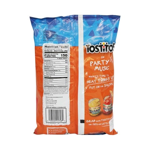 Tostitos - Multigrain Tortilla Chips - Rounds Tostitos Multigrain Rounds tortilla chips are made with the goodness of four grains: corn, buckwheat flour, whole oat flour and whole wheat flour. ... Nutrition Facts. Serving Size 50 GR. Calories 260 % Daily. Value* Fat 13g. 20 %. Saturated Fat 1.5g. 9 % + Trans 0g. Carbohydrate 33g. Fibre 3g. 13 %. Sugars 1g. Protein 3g. Cholesterol 0mg ...